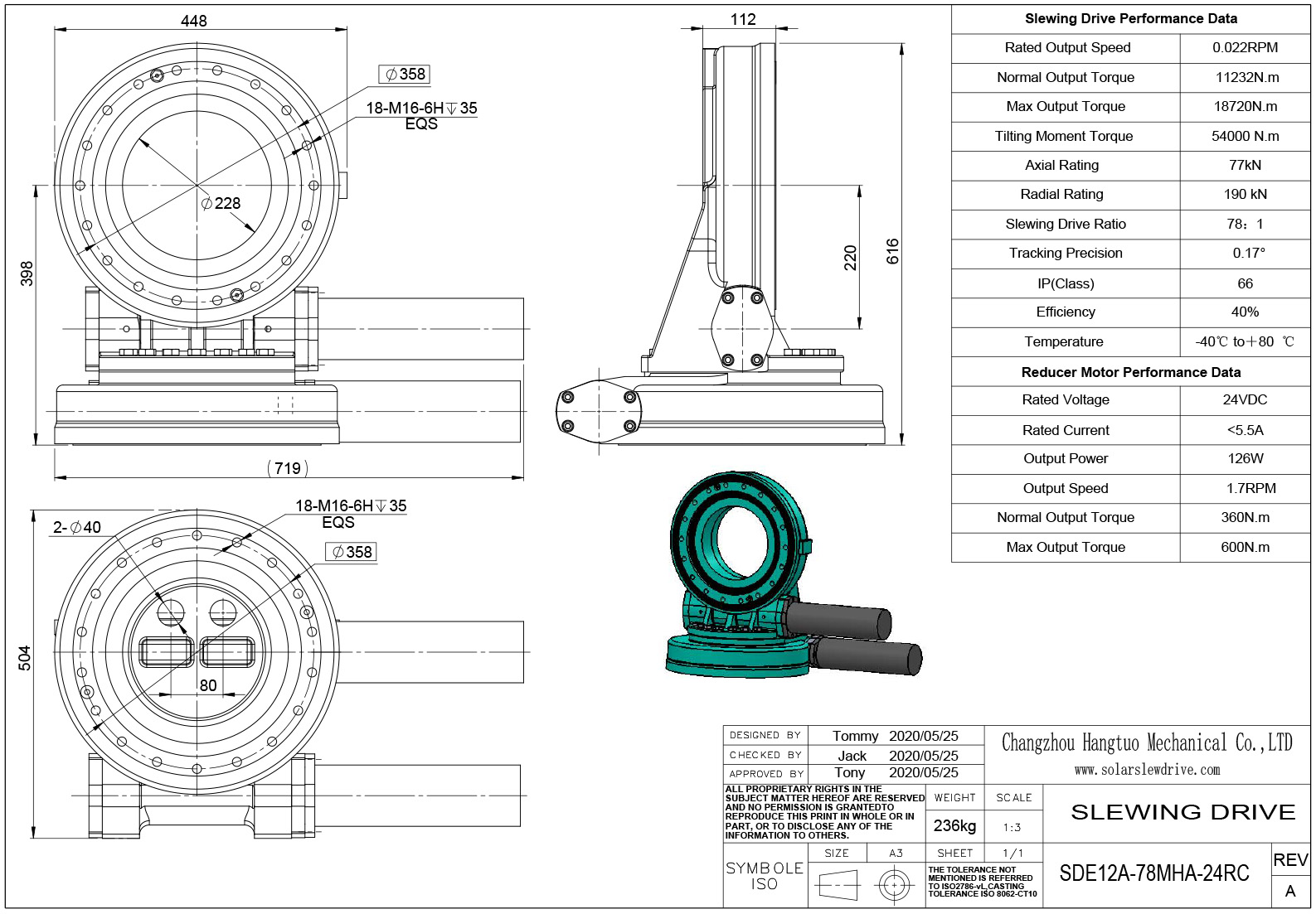 The dual axis slewing drive is a highly integrated unit designed for both vertical and horizontal mounting applications. It combines a slewing bearing, worm gear transmission, motor and sealing system into a compact and robust structure.