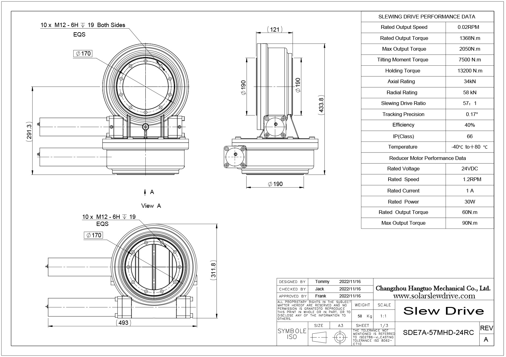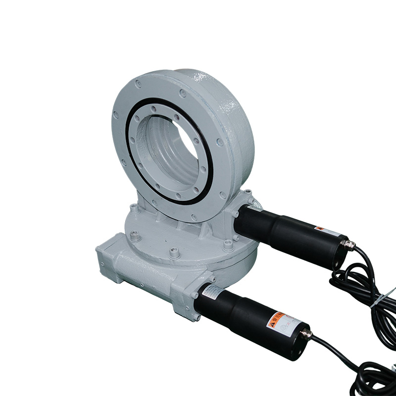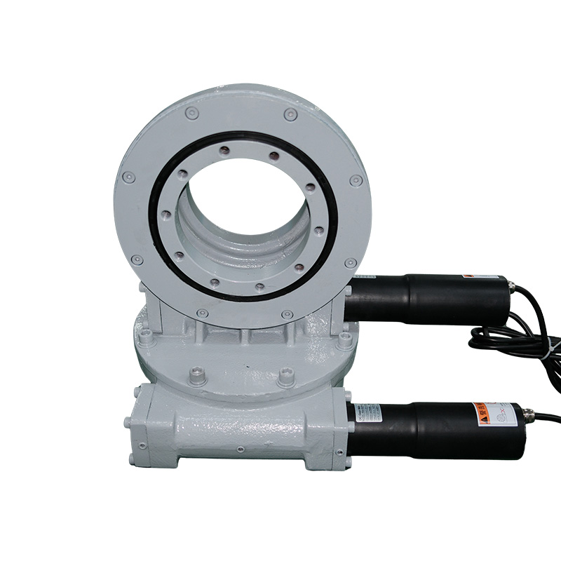 The dual axis slewing drive is a highly integrated unit designed for both vertical and horizontal mounting applications. It combines a slewing bearing, worm gear transmission, motor and sealing system into a compact and robust structure.