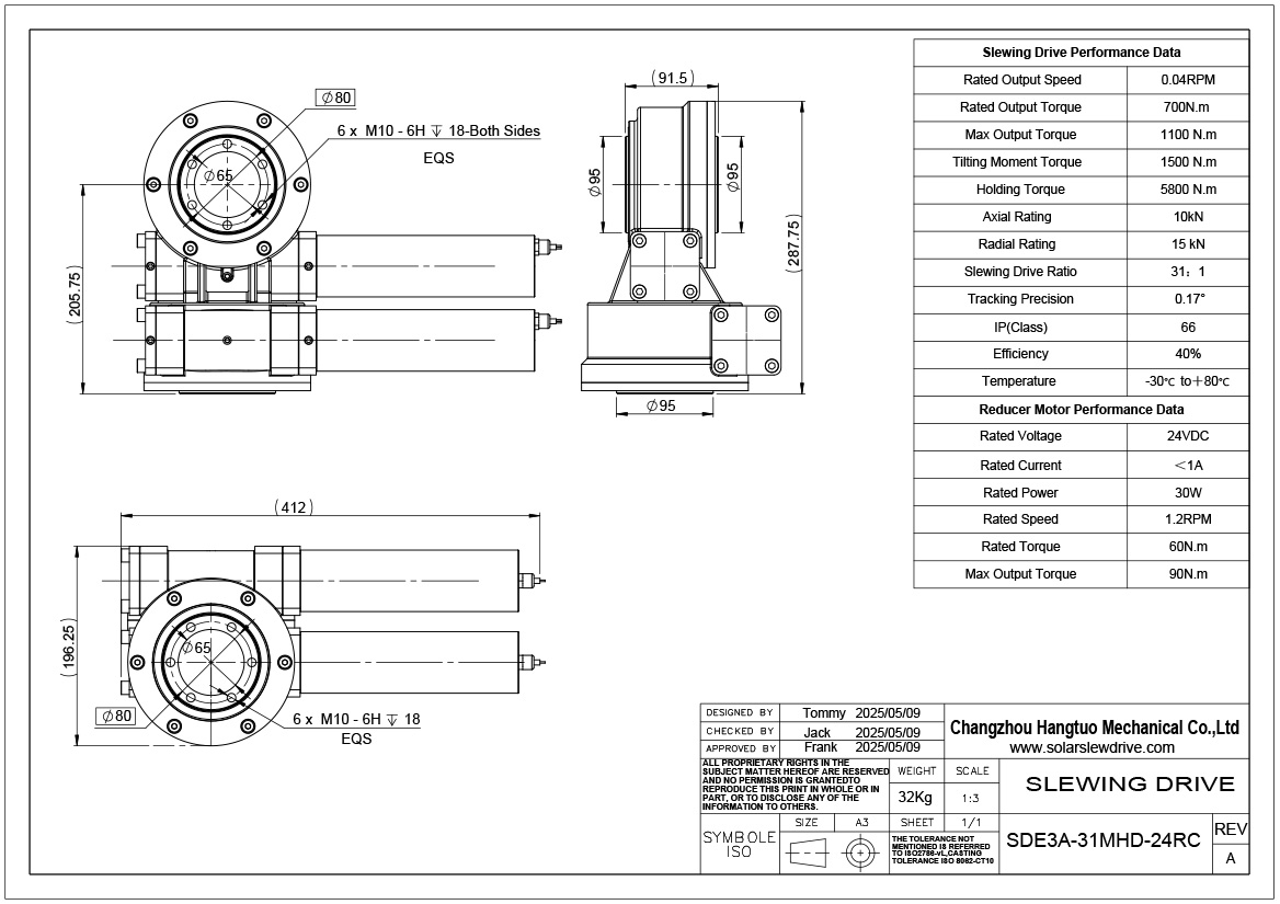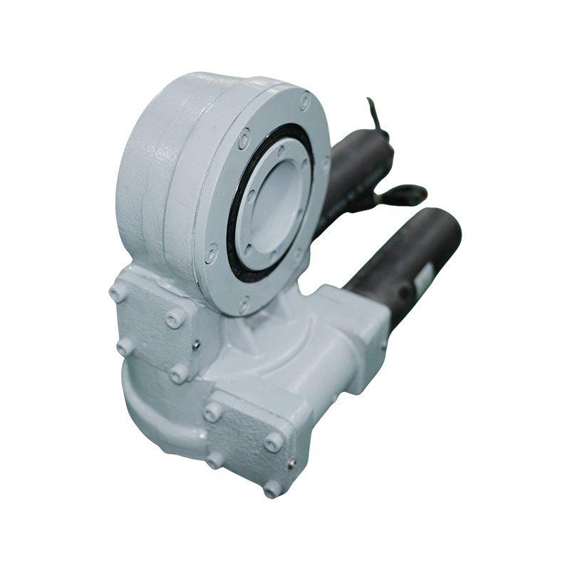 The dual axis slewing drive is a highly integrated unit designed for both vertical and horizontal mounting applications. It combines a slewing bearing, worm gear transmission, motor and sealing system into a compact and robust structure.